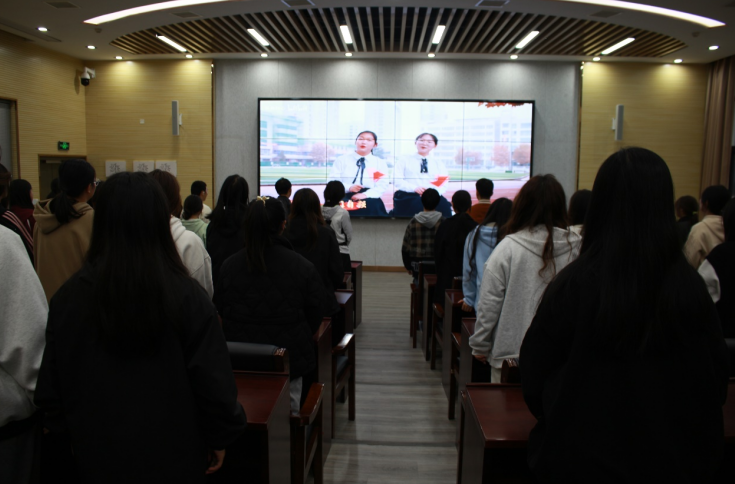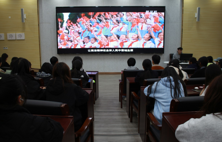 师生首先一同观看微视频《宪法就在我们身边》,该视频讲述了法治模范秦硕、牟昊晨、谭婷的故事,以贴近生活的视角、生动详实的案例,将宪法与同学们的日常生活紧密联系起来,让同学们直观感受到宪法的守护,为同学们践行宪法精神、捍卫宪法尊严树立了学习的标杆,激励着大家在生活中积极效仿,更好地尊崇宪法。