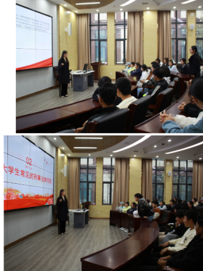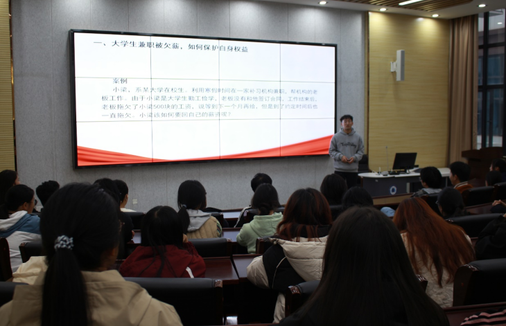 随后,教师代表聚焦大学生在校期间极易遇到的权益纠纷问题,如兼职欠薪、非法“翻墙”行为以及“校园贷”等问题,从法律层面阐释了这些行为的性质与危害,给出了一系列切实可行的应对策略,增强了学生依法维权的意识,明确了法律作为行为规范和个人权益保护工具的双重角色。