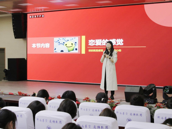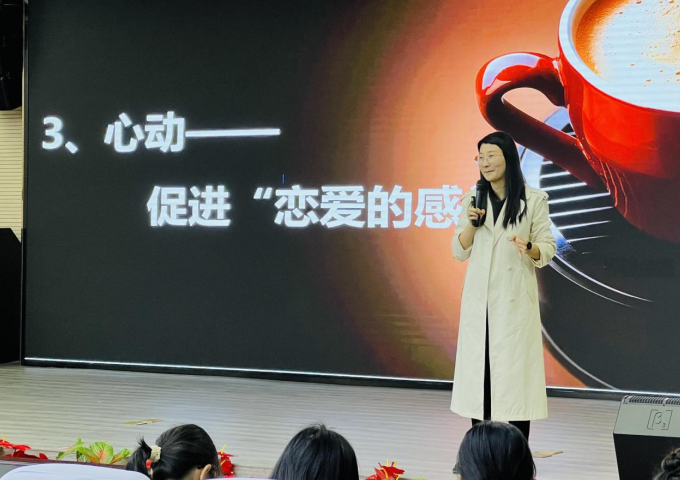 谈到恋爱这个话题,熊婕老师提出“完美的爱”这一理论,即为亲密+激情+承诺。她还结合许多现实例子,引导女生们什么是正确的爱,以及正视自己身体的重要性。
