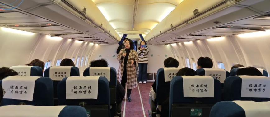 随后,同学们有序登机,空中乘务专业学生呈现精彩的模拟客舱服务。主持人引导同学们分享梦想时,一位学生难掩激动:“感谢学院组织的本次活动,做空姐是我长久以来的梦想,这次活动给了我重燃奋斗的希望,我定努力学习,争取早日翱翔蓝天,回报社会。”学院实训中心主任马静芬老师也鼓励同学们勇敢战胜困难,胸怀壮志,奋力追寻梦想。