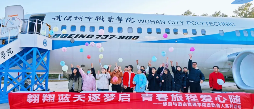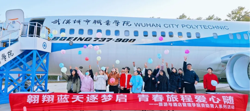 11月28日下午,武汉城市职业学院旅游与酒店管理学院在位于学校东门的空中乘务综合实训基地(窄体干线737-900飞机)成功开展了“翱翔蓝天逐梦启·青春旅程爱心随”资助育人系列活动(二),现场气氛热烈非凡。