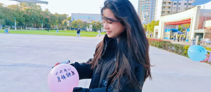 活动伊始,学院“金牌导游讲解队”的讲解员赵国辉带领同学们深入探索窄体飞机及航空知识。同学们漫步至机翼下,志愿者递上象征“希望与梦想”的气球,大家满怀憧憬地写下梦想,在寒风中齐声呐喊,放飞承载希望的气球。